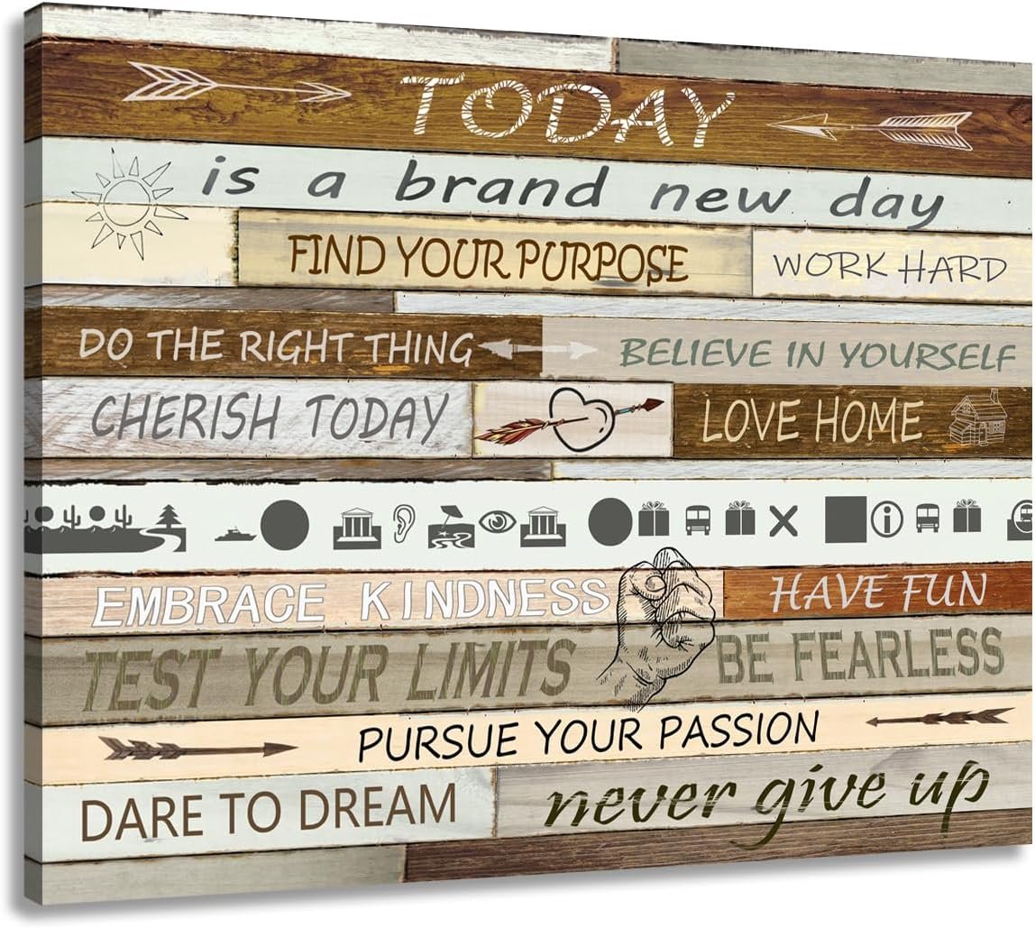 Looking for a way to add charm and positivity to your home or office? This premium canvas wall art is designed to bring inspiration and elegance to any room. Featuring uplifting quotes and motivational phrases in rustic brown and gray tones, this wall decor is perfect for those seeking a daily dose of encouragement and beauty. The carefully crafted weathered wood plank design creates a warm and inviting atmosphere.
