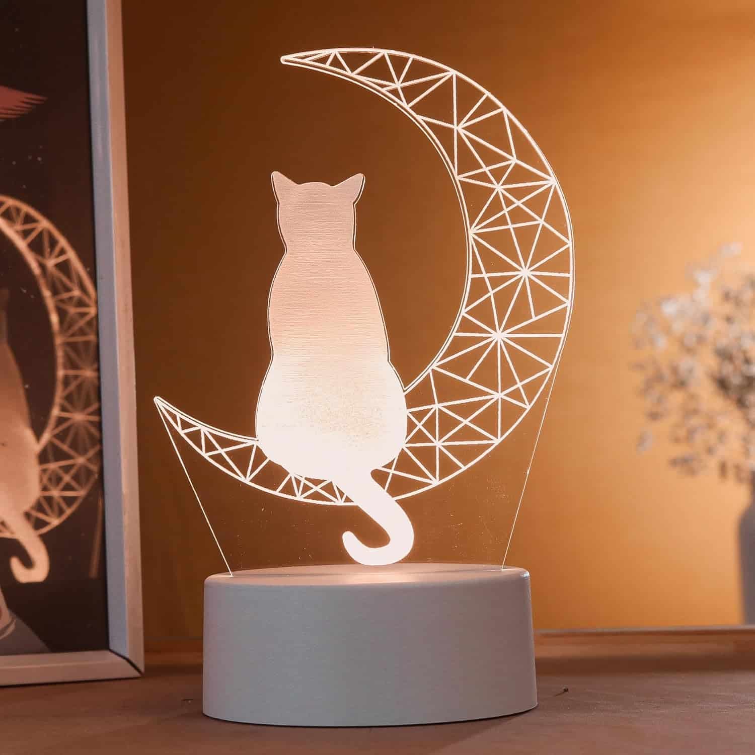 Projetada com um acrílico de alta qualidade em formato 3D, esta abajur destaca-se pelo belíssimo desenho de um gato na lua, que é ideal para amantes de felinos ou para quem procura adicionar um toque poético à decoração. Além disso, o produto traz uma base branca elegante com cabo USB integrado, garantindo praticidade e facilidade na conexão. É mais do que uma luminária; é uma peça-decorativa pensada para transformar o seu espaço com exclusividade e estilo.