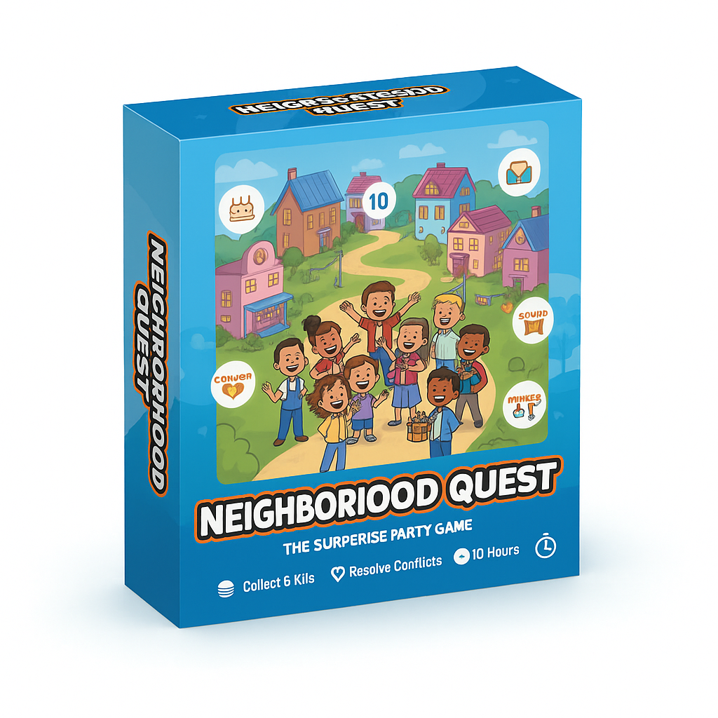 Neighborhood Quest is a collaborative board game where players work together to plan a surprise party for someone new in town.